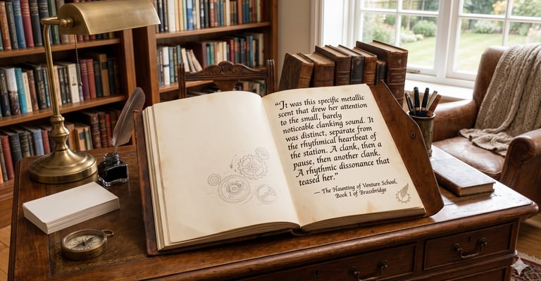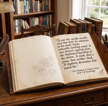 "The Haunting of Venture School" weaves a spellbinding tale of mystery and desire in a world where Victorian propriety clashes with raw passion, and where the whir of gears and the hiss of steam mask the sound of racing hearts. This captivating entry in the Brassbridge series promises readers an intoxicating blend of steampunk adventure, intellectual intrigue, and smoldering romance that will leave them breathless for more.